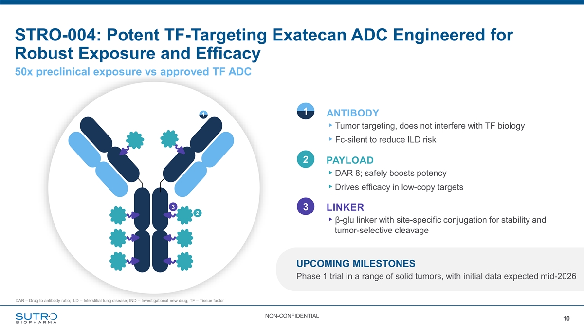 STRO-004: Potent TF-Targeting Exatecan ADC Engineered for Robust Exposure and Efficacy 50x preclinical exposure vs approved TF ADC 1 ANTIBODY 1 ▸Tumor targeting, does not interfere with TF biology ▸Fc-silent to reduce ILD risk 2 PAYLOAD ▸DAR 8; safely boosts potency ▸Drives efficacy in low-copy targets 3 3 LINKER 2 ▸β-glu linker with site-specific conjugation for stability and tumor-selective cleavage UPCOMING MILESTONES Phase 1 trial in a range of solid tumors, with initial data expected mid-2026 DAR – Drug to antibody ratio; ILD – Interstitial lung disease; IND – Investigational new drug; TF – Tissue factor NON-CONFIDENTIAL 10