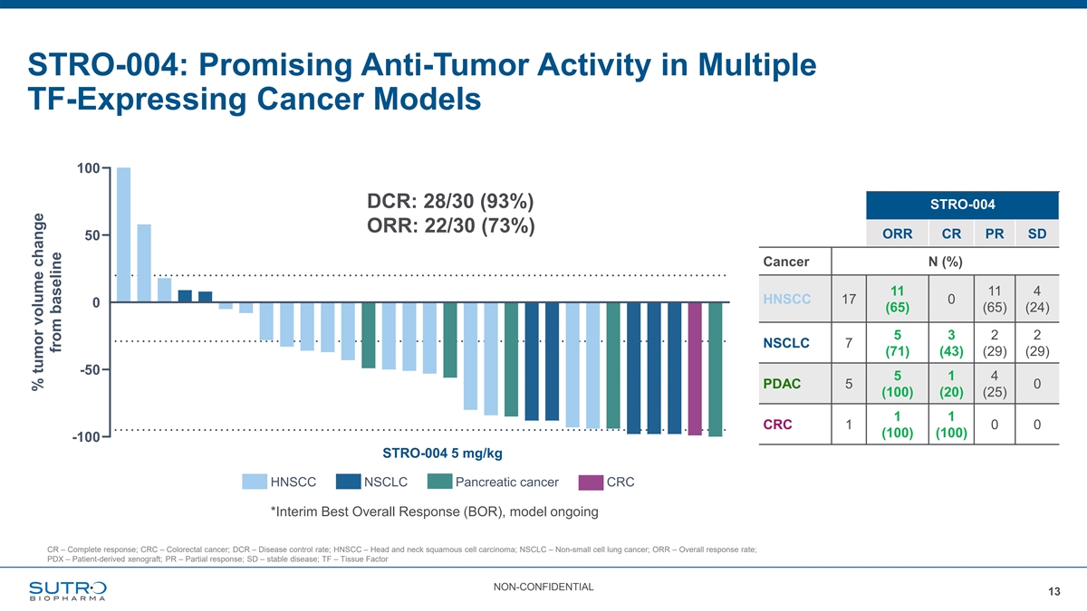 STRO-004: Favorable In Vitro Tolerability Profile vs. Approved TF ADC Eye Inflammation Skin Toxicities STRO-004 Human Corneal Epithelial Cells Human Keratinocytes Reduced Bleeding Risk 50% 46% 40% 30% 20% 10% 1% 0% STRO-004 Tisotumab Up to 70% of Tivdak-treated STRO-004 (DAR8-exatecan) Approved TF ADC (DAR4-MMAE) patients have treatment-emergent bleeding adverse events Inhibition of coagulation, expressed as % inhibition DAR – Drug to antibody ratio; MMAE – Monomethyl auristatin E; TF – Tissue factor of Factor X (FX) conversion in an in vitro assay NON-CONFIDENTIAL 12