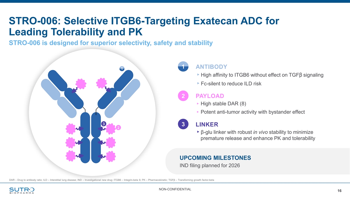 STRO-006: Selective ITGB6-Targeting Exatecan ADC for Leading Tolerability and PK STRO-006 is designed for superior selectivity, safety and stability 1 ANTIBODY 1 ▸High affinity to ITGB6 without effect on TGFβ signaling ▸Fc-silent to reduce ILD risk 2 PAYLOAD ▸ High stable DAR (8) ▸ Potent anti-tumor activity with bystander effect 3 3 LINKER 2 ▸β-glu linker with robust in vivo stability to minimize premature release and enhance PK and tolerability UPCOMING MILESTONES IND filing planned for 2026 DAR – Drug to antibody ratio; ILD – Interstitial lung disease; IND – Investigational new drug; ITGB6 – Integrin-beta 6; PK – Pharmacokinetic; TGFβ – Transforming growth factor-beta NON-CONFIDENTIAL 16
