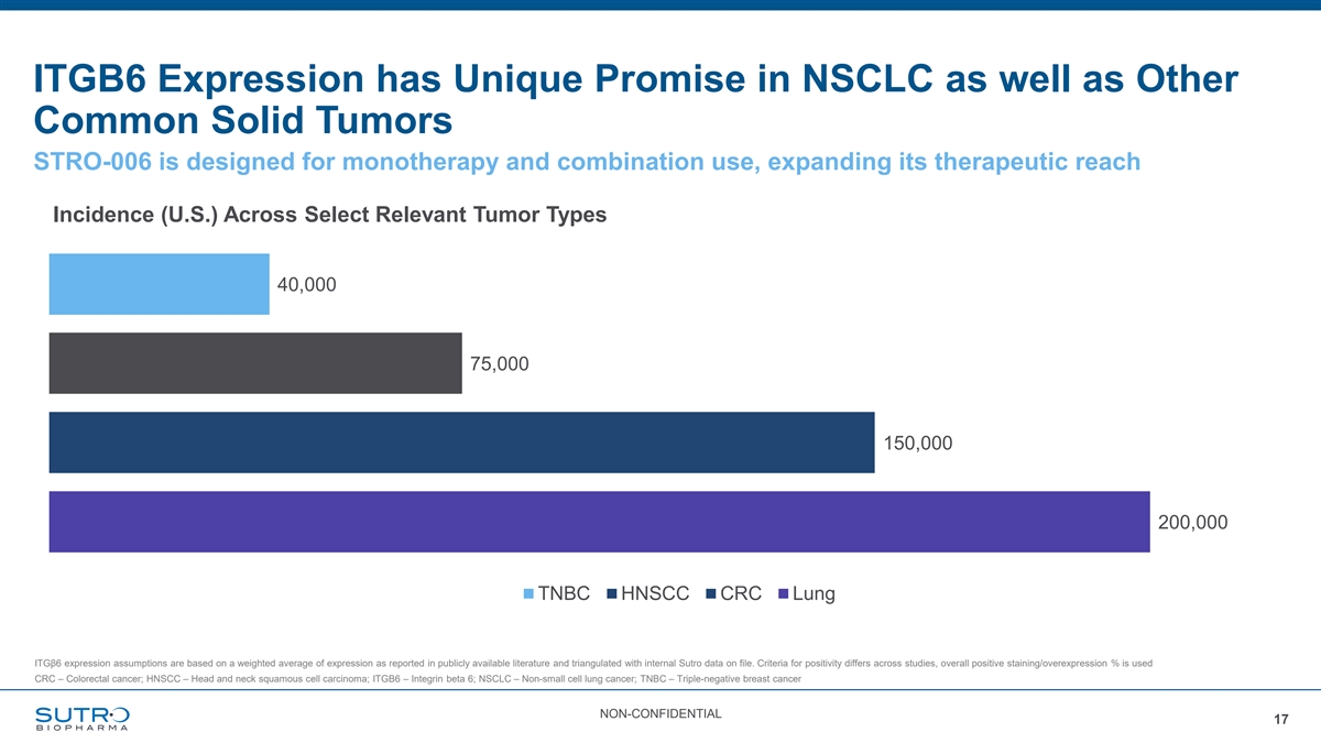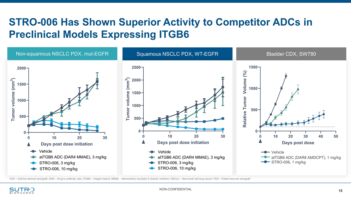 ITGB6 Expression has Unique Promise in NSCLC as well as Other Common Solid Tumors STRO-006 is designed for monotherapy and combination use, expanding its therapeutic reach Incidence (U.S.) Across Select Relevant Tumor Types 40,000 75,000 150,000 200,000 TNBC HNSCC CRC Lung ITGβ6 expression assumptions are based on a weighted average of expression as reported in publicly available literature and triangulated with internal Sutro data on file. Criteria for positivity differs across studies, overall positive staining/overexpression % is used CRC – Colorectal cancer; HNSCC – Head and neck squamous cell carcinoma; ITGB6 – Integrin beta 6; NSCLC – Non-small cell lung cancer; TNBC – Triple-negative breast cancer NON-CONFIDENTIAL 17