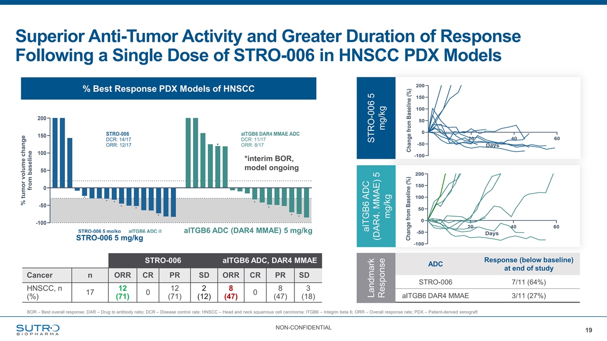 Superior Anti-Tumor Activity and Greater Duration of Response Following a Single Dose of STRO-006 in HNSCC PDX Models 200 % Best Response PDX Models of HNSCC 150 100 200 50 % Best Response in PDX Models of HNSCC 0 STRO-006 aITGB6 DAR4 MMAE ADC 150 20 40 60 DCR: 14/17 DCR: 11/17 -50 ORR: 12/17 * ORR: 8/17 Days 100 -100 *interim BOR, model ongoing 50 200 19 150 0 100 * * * * -50 * * * 50 * * * 0 -100 20 40 60 *: interim readout, model ongoing STRO-006 5 mg/kg aITGB6 ADC (DAR4 MMAa ElTGB6 ) 5 mg/kg ADC (DAR4 MMAE) 5 mg/kg -50 Days STRO-006 5 mg/kg -100 Response (below baseline) STRO-006 aITGB6 ADC, DAR4 MMAE ADC at end of study Cancer n ORR CR PR SD ORR CR PR SD STRO-006 7/11 (64%) HNSCC, n 12 12 2 8 8 3 17 0 0 aITGB6 DAR4 MMAE 3/11 (27%) (%) (71) (71) (12) (47) (47) (18) BOR – Best overall response; DAR – Drug to antibody ratio; DCR – Disease control rate; HNSCC – Head and neck squamous cell carcinoma; ITGB6 – Integrin beta 6; ORR – Overall response rate; PDX – Patient-derived xenograft NON-CONFIDENTIAL 19 % tumor volume change from baseline aITGB6 ADC Landmark STRO-006 5 (DAR4. MMAE) 5 Response mg/kg mg/kg Change from Baseline (%) Change from Baseline (%)