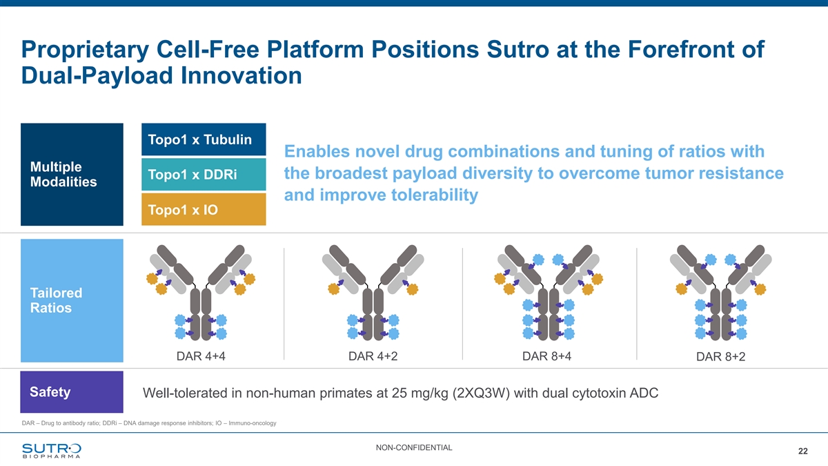 Dual-Payload ADCs: Targeted Combination Therapy to Improve Outcomes Combination treatment approaches have been shown to improve outcomes in oncology vs single agent chemotherapy and remain standard of care in many therapeutic areas Dual-Payload ADCs: Potential to Become Future Standard of Care • Overcomes resistance resulting from conventional ADCs • Reduces toxicity over ADC combination approaches • Unique benefits from simultaneous delivery of payloads within the tumor cells • Simplified development path compared to combination treatment regimens • Unlocks broader market potential across tumor types NON-CONFIDENTIAL 21