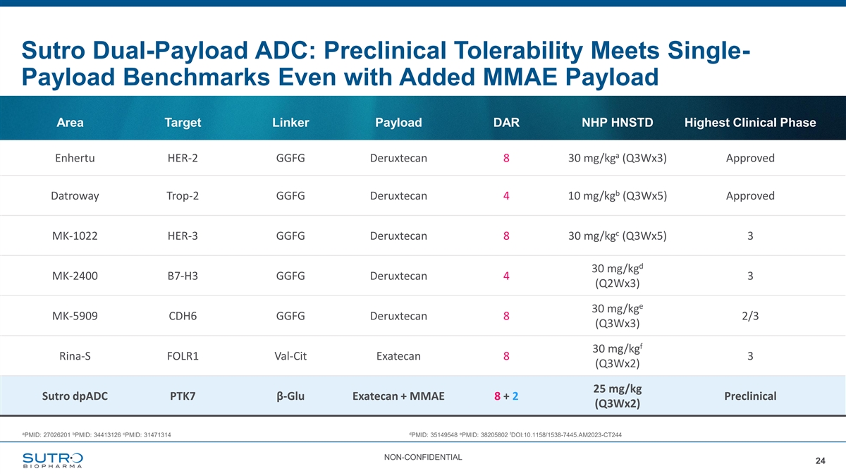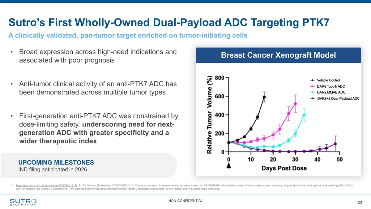 Sutro’s First Wholly-Owned Dual-Payload ADC Targeting PTK7 A clinically validated, pan-tumor target enriched on tumor-initiating cells • Broad expression across high-need indications and Breast Cancer Xenograft Model associated with poor prognosis • Anti-tumor clinical activity of an anti-PTK7 ADC has been demonstrated across multiple tumor types • First-generation anti-PTK7 ADC was constrained by dose-limiting safety, underscoring need for next- generation ADC with greater specificity and a wider therapeutic index UPCOMING MILESTONES IND filing anticipated in 2026 *1: https://pmc.ncbi.nlm.nih.gov/articles/PMC9401513/ 2: *for Ovarian (Pt-resistant)/TNBC/NSCLC 3: The most common, treatment-related adverse events for PF-06647020 administered every 3 weeks were nausea, alopecia, fatigue, headache, neutropenia, and vomiting (45%–25%); 25% of patients had grade ≥ 3 neutropenia. Two patients experienced dose-limiting toxicities (grade 3 headache and fatigue) at the highest every 3 weeks dose evaluated. NON-CONFIDENTIAL 23