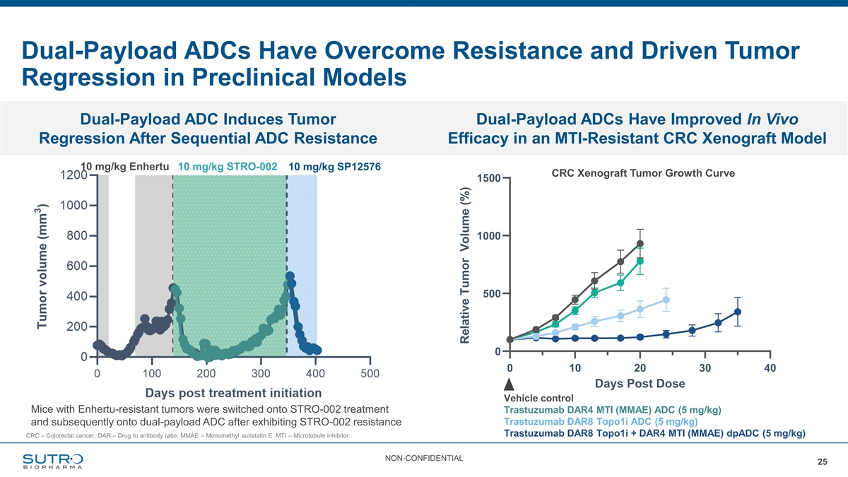 Sutro Dual-Payload ADC: Preclinical Tolerability Meets Single- Payload Benchmarks Even with Added MMAE Payload Area Target Linker Payload DAR NHP HNSTD Highest Clinical Phase a Enhertu HER-2 GGFG Deruxtecan 8 30 mg/kg (Q3Wx3) Approved b Datroway Trop-2 GGFG Deruxtecan 4 10 mg/kg (Q3Wx5) Approved c MK-1022 HER-3 GGFG Deruxtecan 8 30 mg/kg (Q3Wx5) 3 d 30 mg/kg MK-2400 B7-H3 GGFG Deruxtecan 4 3 (Q2Wx3) e 30 mg/kg MK-5909 CDH6 GGFG Deruxtecan 8 2/3 (Q3Wx3) f 30 mg/kg Rina-S FOLR1 Val-Cit Exatecan 8 3 (Q3Wx2) 25 mg/kg Sutro dpADC PTK7β-Glu Exatecan + MMAE 8 + 2 Preclinical (Q3Wx2) a b c d e f PMID: 27026201 PMID: 34413126 PMID: 31471314 PMID: 35149548 PMID: 38205802 DOI:10.1158/1538-7445.AM2023-CT244 NON-CONFIDENTIAL 24