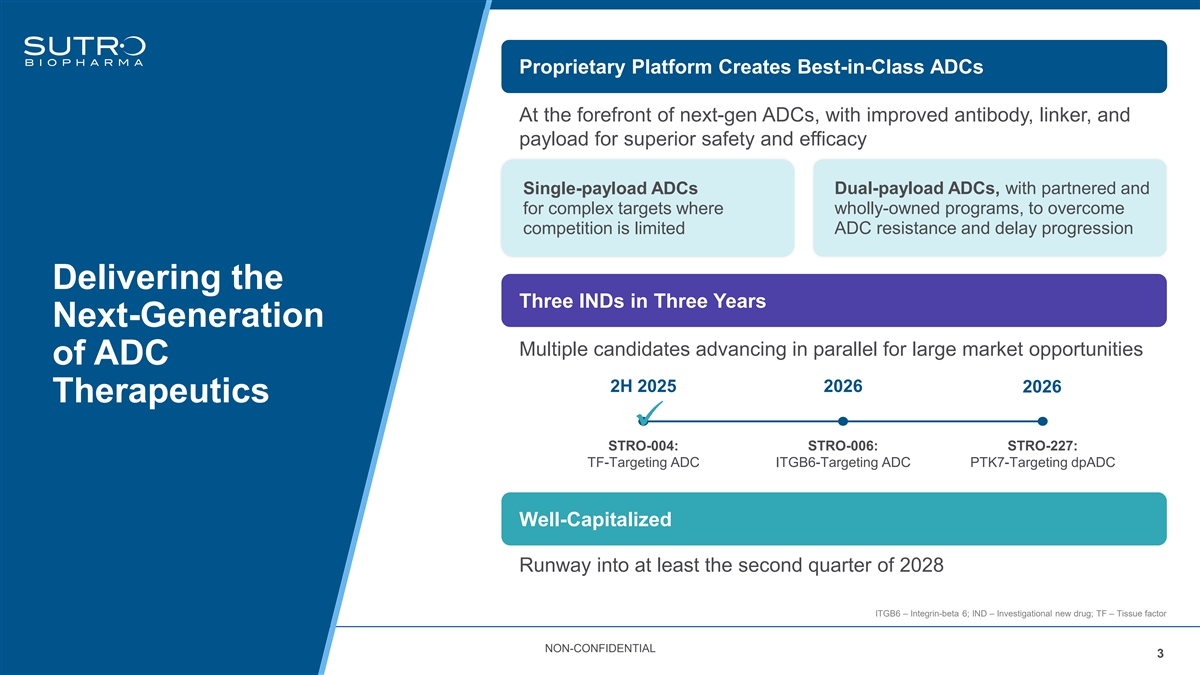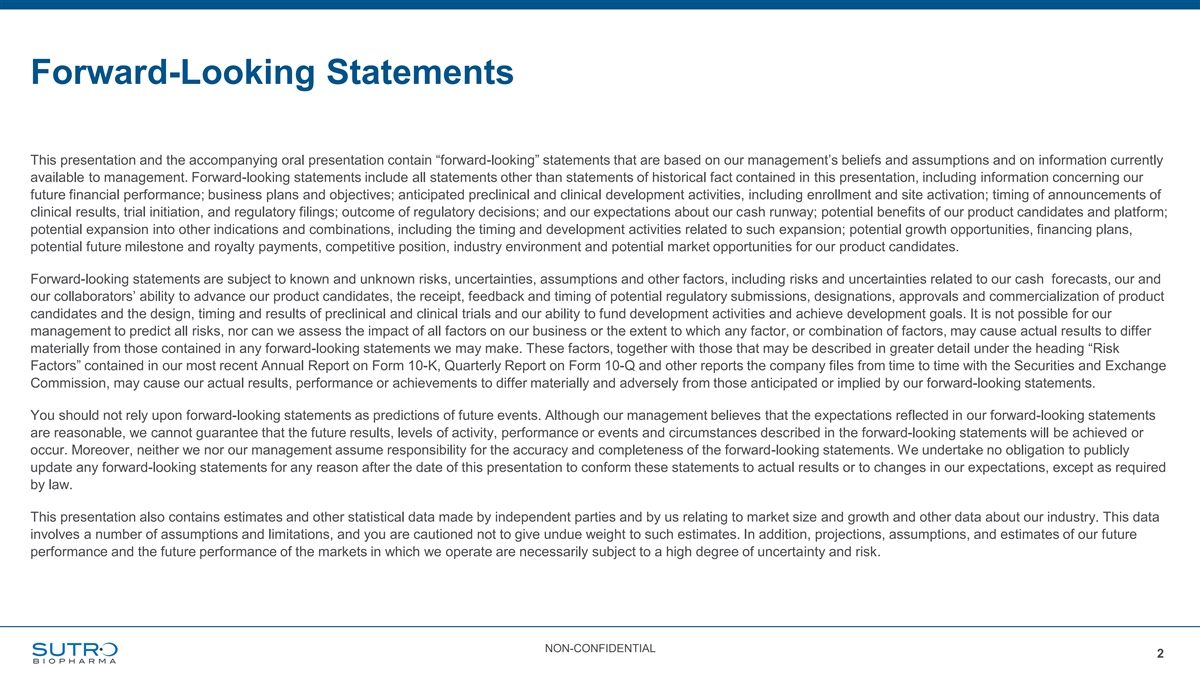 Forward-Looking Statements This presentation and the accompanying oral presentation contain “forward-looking” statements that are based on our management’s beliefs and assumptions and on information currently available to management. Forward-looking statements include all statements other than statements of historical fact contained in this presentation, including information concerning our future financial performance; business plans and objectives; anticipated preclinical and clinical development activities, including enrollment and site activation; timing of announcements of clinical results, trial initiation, and regulatory filings; outcome of regulatory decisions; and our expectations about our cash runway; potential benefits of our product candidates and platform; potential expansion into other indications and combinations, including the timing and development activities related to such expansion; potential growth opportunities, financing plans, potential future milestone and royalty payments, competitive position, industry environment and potential market opportunities for our product candidates. Forward-looking statements are subject to known and unknown risks, uncertainties, assumptions and other factors, including risks and uncertainties related to our cash forecasts, our and our collaborators’ ability to advance our product candidates, the receipt, feedback and timing of potential regulatory submissions, designations, approvals and commercialization of product candidates and the design, timing and results of preclinical and clinical trials and our ability to fund development activities and achieve development goals. It is not possible for our management to predict all risks, nor can we assess the impact of all factors on our business or the extent to which any factor, or combination of factors, may cause actual results to differ materially from those contained in any forward-looking statements we may make. These factors, together with those that may be described in greater detail under the heading “Risk Factors” contained in our most recent Annual Report on Form 10-K, Quarterly Report on Form 10-Q and other reports the company files from time to time with the Securities and Exchange Commission, may cause our actual results, performance or achievements to differ materially and adversely from those anticipated or implied by our forward-looking statements. You should not rely upon forward-looking statements as predictions of future events. Although our management believes that the expectations reflected in our forward-looking statements are reasonable, we cannot guarantee that the future results, levels of activity, performance or events and circumstances described in the forward-looking statements will be achieved or occur. Moreover, neither we nor our management assume responsibility for the accuracy and completeness of the forward-looking statements. We undertake no obligation to publicly update any forward-looking statements for any reason after the date of this presentation to conform these statements to actual results or to changes in our expectations, except as required by law. This presentation also contains estimates and other statistical data made by independent parties and by us relating to market size and growth and other data about our industry. This data involves a number of assumptions and limitations, and you are cautioned not to give undue weight to such estimates. In addition, projections, assumptions, and estimates of our future performance and the future performance of the markets in which we operate are necessarily subject to a high degree of uncertainty and risk. NON-CONFIDENTIAL 2