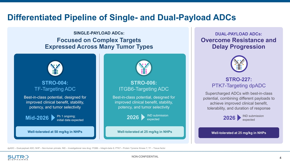Proprietary Platform Creates Best-in-Class ADCs At the forefront of next-gen ADCs, with improved antibody, linker, and payload for superior safety and efficacy Dual-payload ADCs, with partnered and Single-payload ADCs for complex targets where wholly-owned programs, to overcome competition is limited ADC resistance and delay progression Delivering the Three INDs in Three Years Next-Generation Multiple candidates advancing in parallel for large market opportunities of ADC 2H 2025 2026 2026 Therapeutics ✓ STRO-004: STRO-006: STRO-227: TF-Targeting ADC ITGB6-Targeting ADC PTK7-Targeting dpADC Well-Capitalized Runway into at least the second quarter of 2028 ITGB6 – Integrin-beta 6; IND – Investigational new drug; TF – Tissue factor NON-CONFIDENTIAL 3
