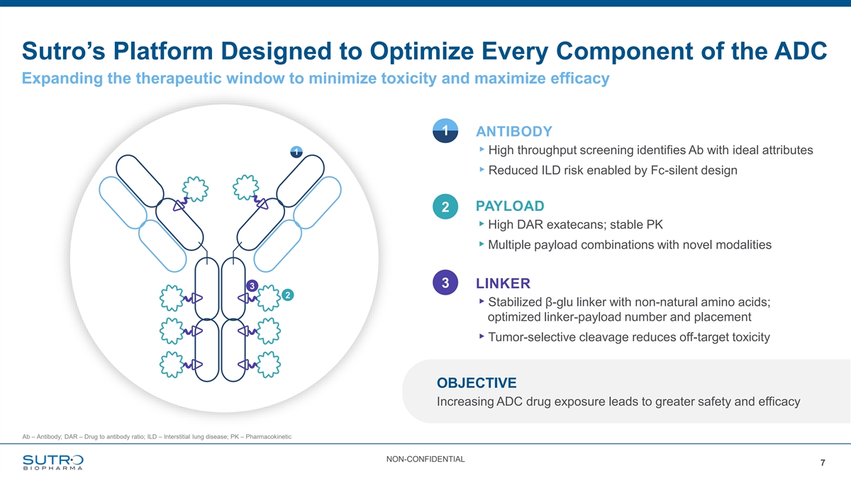 Designed to Deliver: Proprietary platform enables enhanced ADCs Precision Versatility Scalability Same cell-free system from Site-specific conjugation Increased flexibility on linker- discovery to commercial using non-natural amino acids payload number, placement, scale with consistent quality and click chemistry or combinations enables for uniform and stable industry-leading PK and molecules safety profile PK – Pharmacokinetics NON-CONFIDENTIAL 6