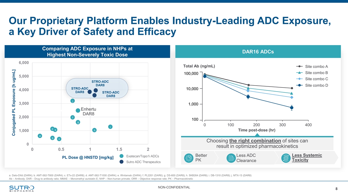 Sutro’s Platform Designed to Optimize Every Component of the ADC Expanding the therapeutic window to minimize toxicity and maximize efficacy 1 ANTIBODY ▸High throughput screening identifies Ab with ideal attributes 1 ▸Reduced ILD risk enabled by Fc-silent design PAYLOAD 2 ▸High DAR exatecans; stable PK ▸Multiple payload combinations with novel modalities 3 LINKER 3 2 ▸Stabilized β-glu linker with non-natural amino acids; optimized linker-payload number and placement ▸Tumor-selective cleavage reduces off-target toxicity OBJECTIVE Increasing ADC drug exposure leads to greater safety and efficacy Ab – Antibody; DAR – Drug to antibody ratio; ILD – Interstitial lung disease; PK – Pharmacokinetic NON-CONFIDENTIAL 7