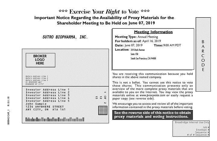 BARCODE See the reverse side of this notice to obtain proxy materials and voting instructions. BROKER LOGO HERE 1 OF 2 12 15 1234567 1234567 1234567 1234567 1234567 1234567 1234567 Broadridge Internal Use Only Job # Envelope # Sequence # # of # Sequence # *** Exercise Your Right to Vote *** Important Notice Regarding the Availability of Proxy Materials for the Shareholder Meeting to Be Held on <mtgdate>. You are receiving this communication because you hold shares in the above named company. This is not a ballot. You cannot use this notice to vote these shares. This communication presents only an overview of the more complete proxy materials that are available to you on the Internet. You may view the proxy materials online at www.proxyvote.com or easily request a paper copy (see reverse side). We encourage you to access and review all of the important information contained in the proxy materials before voting. Meeting Information Meeting Type: <mtgtype> For holders as of: <recdate> Date: Time: <mtgtime> Location: 0000421249_1 R1.0.1.18 SUTRO BIOPHARMA, INC. Annual Meeting June 07, 2019 June 07, 2019 9:00 AM PDT April 16, 2019 310 Utah Avenue Suite 150 South San Francisco, CA 94080 Return Address Line 1 Return Address Line 2 Return Address Line 3 51 MERCEDES WAY EDGEWOOD NY 11717 Investor Address Line 1 Investor Address Line 2 Investor Address Line 3 Investor Address Line 4 Investor Address Line 5 John Sample 1234 ANYWHERE STREET ANY CITY, ON A1A 1A1