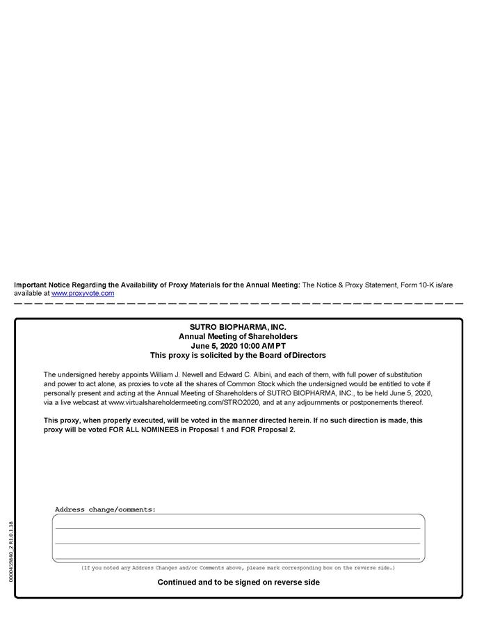 0000459840_2 R1.0.1.18 Important Notice Regarding the Availability of Proxy Materials for the Annual Meeting: The Notice & Proxy Statement, Form 10-K is/are available at www.proxyvote.com SUTRO BIOPHARMA, INC. Annual Meeting of Shareholders June 5, 2020 10:00 AM PT This proxy is solicited by the Board of Directors The undersigned hereby appoints William J. Newell and Edward C. Albini, and each of them, with full power of substitution and power to act alone, as proxies to vote all the shares of Common Stock which the undersigned would be entitled to vote if personally present and acting at the Annual Meeting of Shareholders of SUTRO BIOPHARMA, INC., to be held June 5, 2020, via a live webcast at www.virtualshareholdermeeting.com/STRO2020, and at any adjournments or postponements thereof. This proxy, when properly executed, will be voted in the manner directed herein. If no such direction is made, this proxy will be voted FOR ALL NOMINEES in Proposal 1 and FOR Proposal 2. Address change/comments: (If you noted any Address Changes and/or Comments above, please mark corresponding box on the reverse side.) Continued and to be signed on reverse side